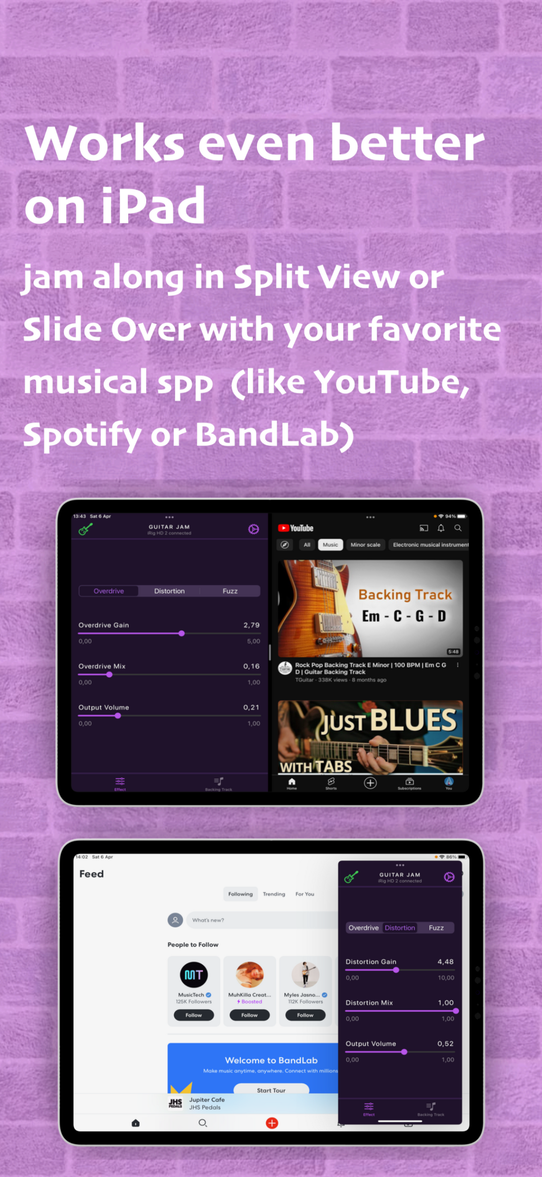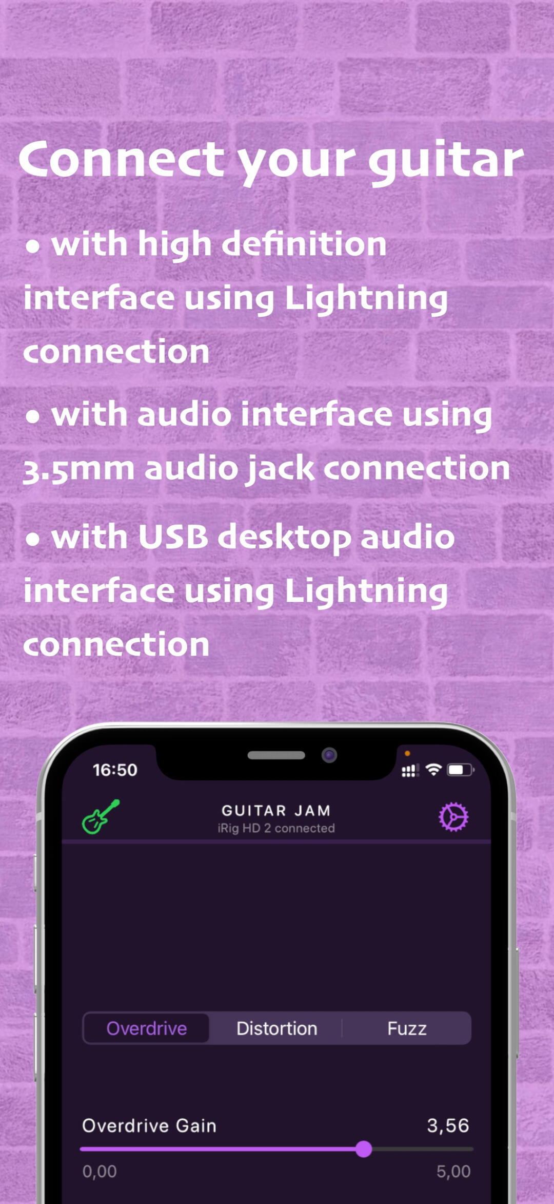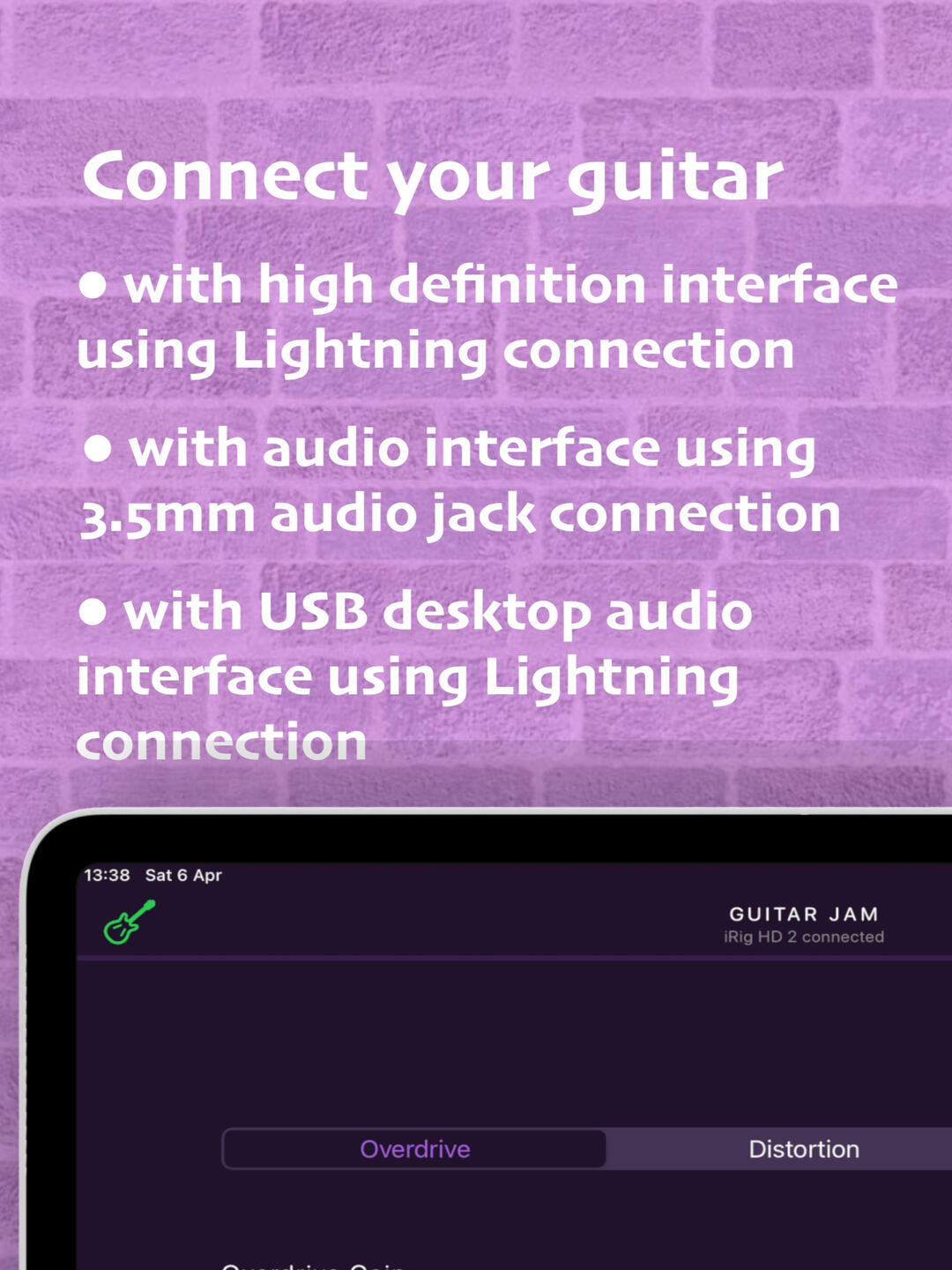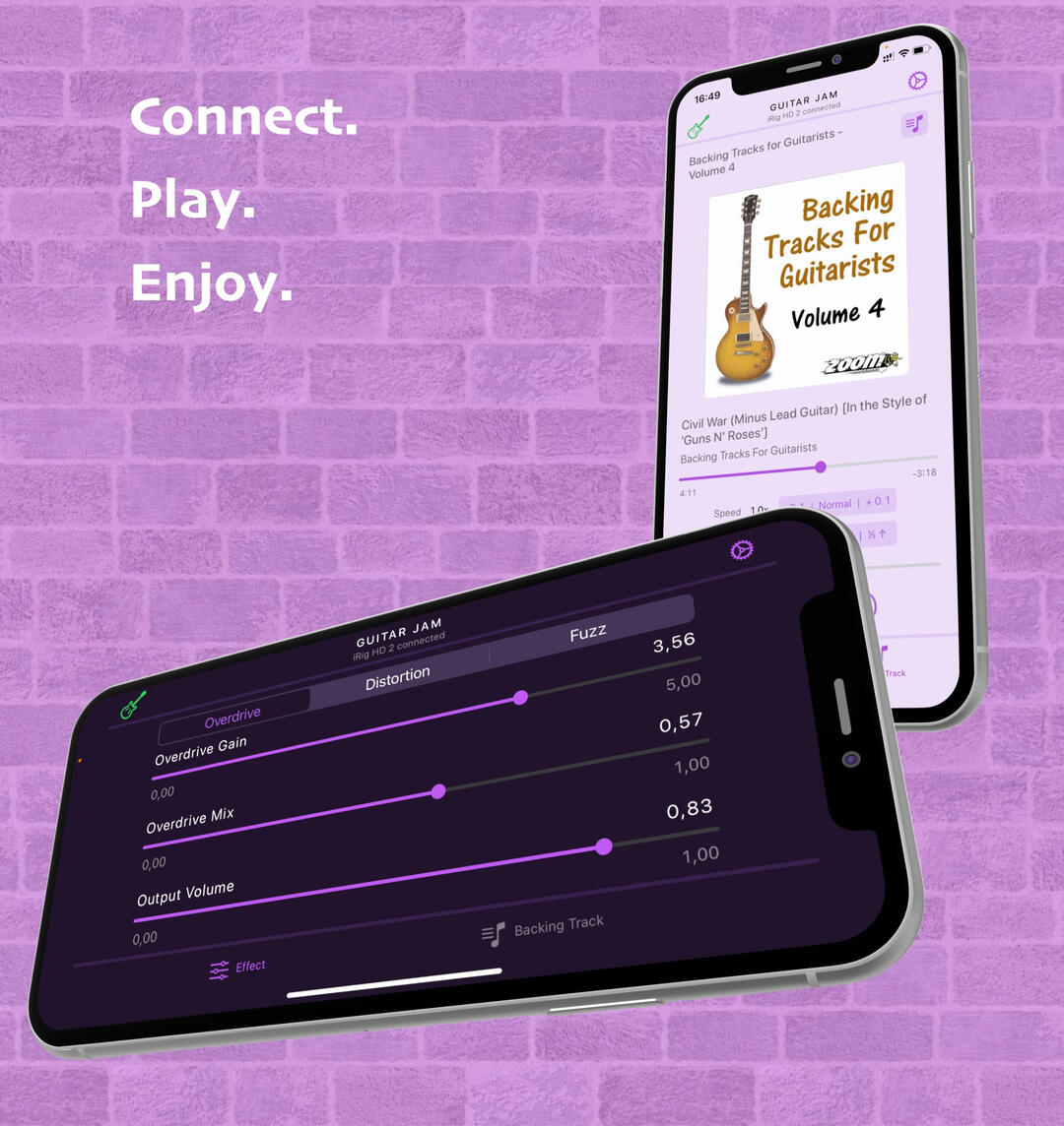 Connect your guitar. Play the backing track. Enjoy the music.∘ Connect your guitar with high definition digital guitar interface (like iRig HD 2 from IK Multimedia or Go Guitar Pro from TC Helicon or similar) using Lightning connection.∘ Or audio guitar interface (like iRig 2 from IK Multimedia or Go Guitar from TC Helicon or similar) using 3.5mm audio jack connection.∘ Or USB desktop audio interface (like Scarlett 2i2 from Focusrite or Komplete Audio 2 from Native Instruments). Please note, Apple Camera Connection Kit or powered USB hub is required to provide enough power for the audio interface.∘ Apply built-in guitar effects like overdrive, distortion or fuzz, if needed.∘ Select your favorite backing track from the music library on your device.∘ Start playing along with the backing track. Set the playback speed and pitch accordingly.∘ Or run your favorite musical app in background (like Youtube, Spotify, BandLab, etc.), select a backing track and start jamming along. Guitar Jam runs seamlessly with any audio provided by any other app on a device.Guitar Jam supports version iOS 15 or later.Stay tuned for upcoming updates and rock on!