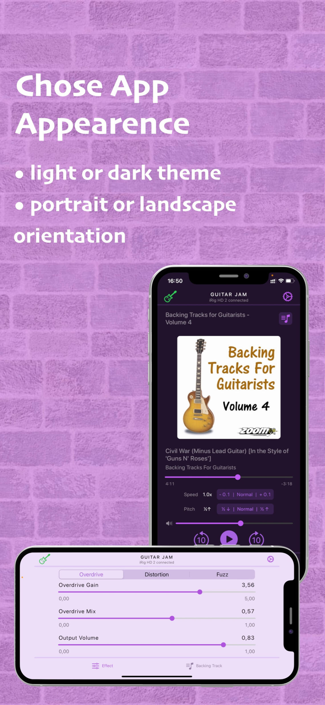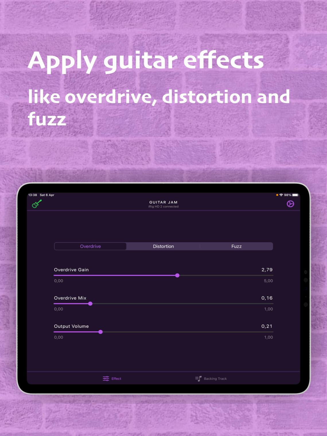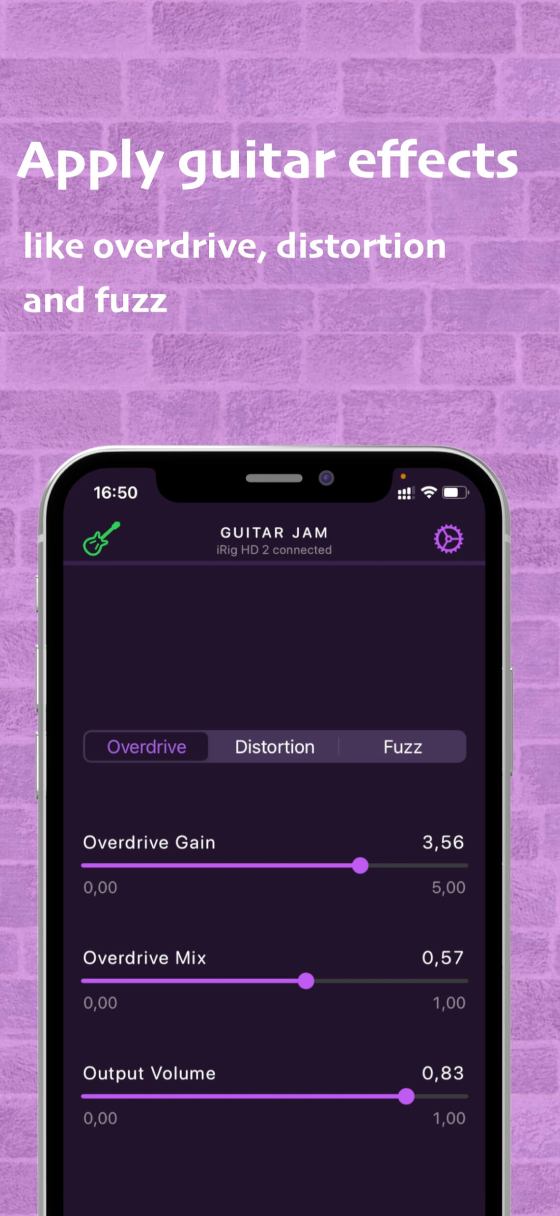 Connect your guitar. Play the backing track. Enjoy the music.∘ Connect your guitar with high definition digital guitar interface (like iRig HD 2 from IK Multimedia or Go Guitar Pro from TC Helicon or similar) using Lightning connection.∘ Or audio guitar interface (like iRig 2 from IK Multimedia or Go Guitar from TC Helicon or similar) using 3.5mm audio jack connection.∘ Or USB desktop audio interface (like Scarlett 2i2 from Focusrite or Komplete Audio 2 from Native Instruments). Please note, Apple Camera Connection Kit or powered USB hub is required to provide enough power for the audio interface.∘ Apply built-in guitar effects like overdrive, distortion or fuzz, if needed.∘ Select your favorite backing track from the music library on your device.∘ Start playing along with the backing track. Set the playback speed and pitch accordingly.∘ Or run your favorite musical app in background (like Youtube, Spotify, BandLab, etc.), select a backing track and start jamming along. Guitar Jam runs seamlessly with any audio provided by any other app on a device.Guitar Jam supports version iOS 15 or later.Stay tuned for upcoming updates and rock on!
