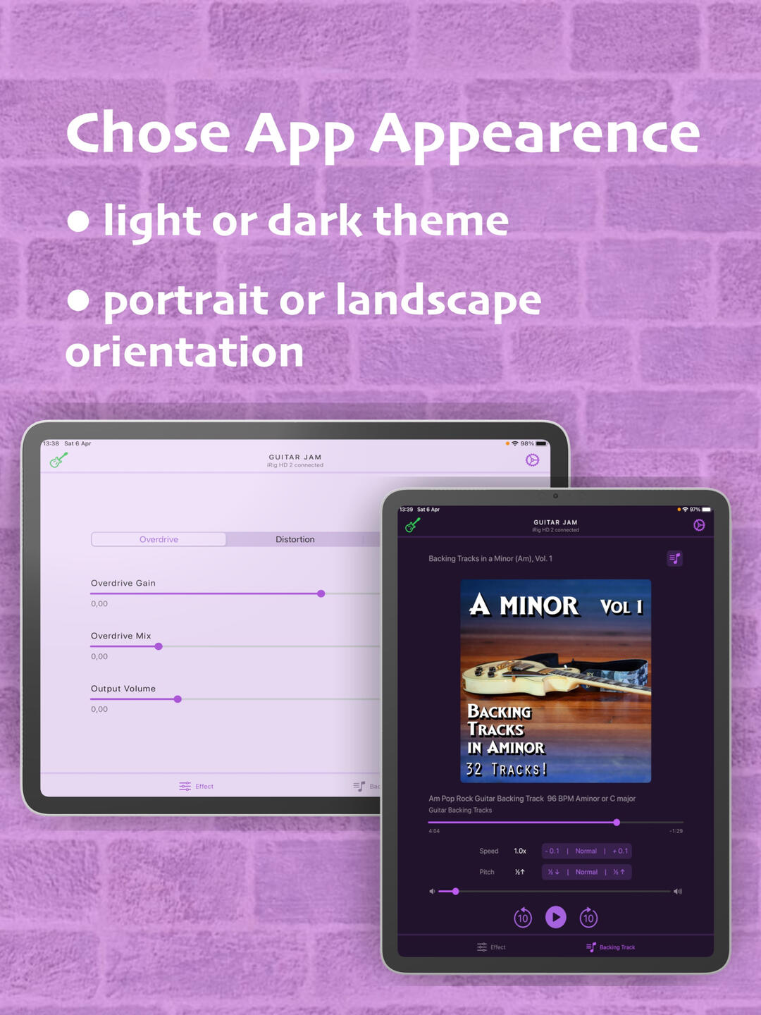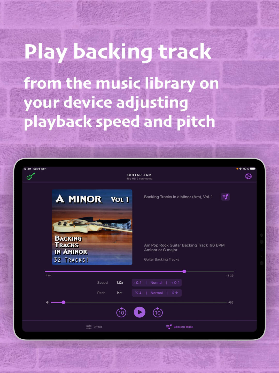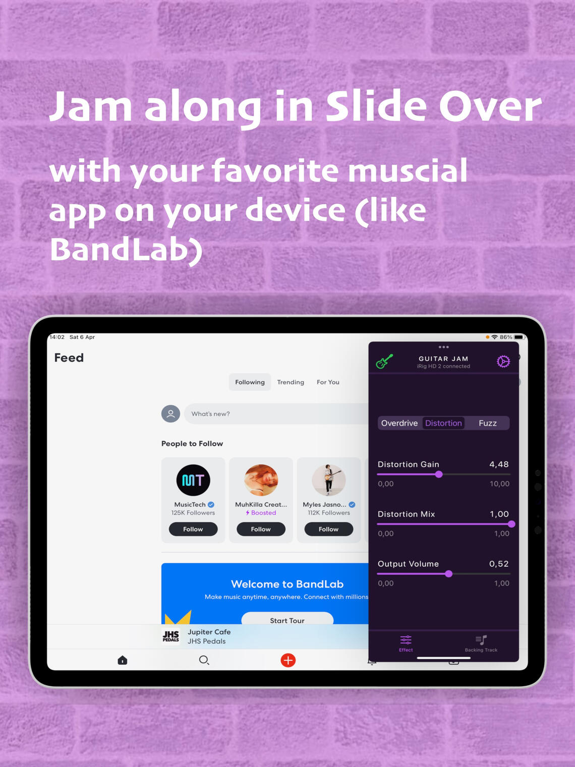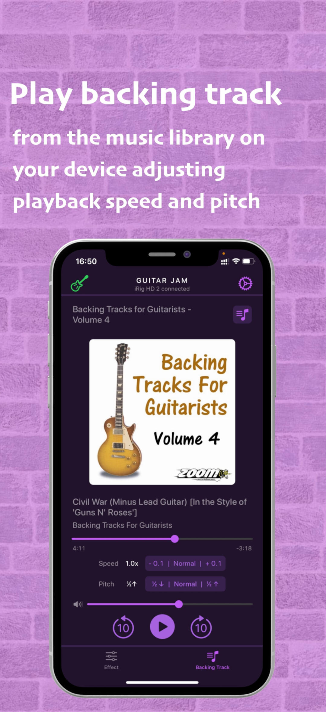 Connect your guitar. Play the backing track. Enjoy the music.∘ Connect your guitar with high definition digital guitar interface (like iRig HD 2 from IK Multimedia or Go Guitar Pro from TC Helicon or similar) using Lightning connection.∘ Or audio guitar interface (like iRig 2 from IK Multimedia or Go Guitar from TC Helicon or similar) using 3.5mm audio jack connection.∘ Or USB desktop audio interface (like Scarlett 2i2 from Focusrite or Komplete Audio 2 from Native Instruments). Please note, Apple Camera Connection Kit or powered USB hub is required to provide enough power for the audio interface.∘ Apply built-in guitar effects like overdrive, distortion or fuzz, if needed.∘ Select your favorite backing track from the music library on your device.∘ Start playing along with the backing track. Set the playback speed and pitch accordingly.∘ Or run your favorite musical app in background (like Youtube, Spotify, BandLab, etc.), select a backing track and start jamming along. Guitar Jam runs seamlessly with any audio provided by any other app on a device.Guitar Jam supports version iOS 15 or later.Stay tuned for upcoming updates and rock on!