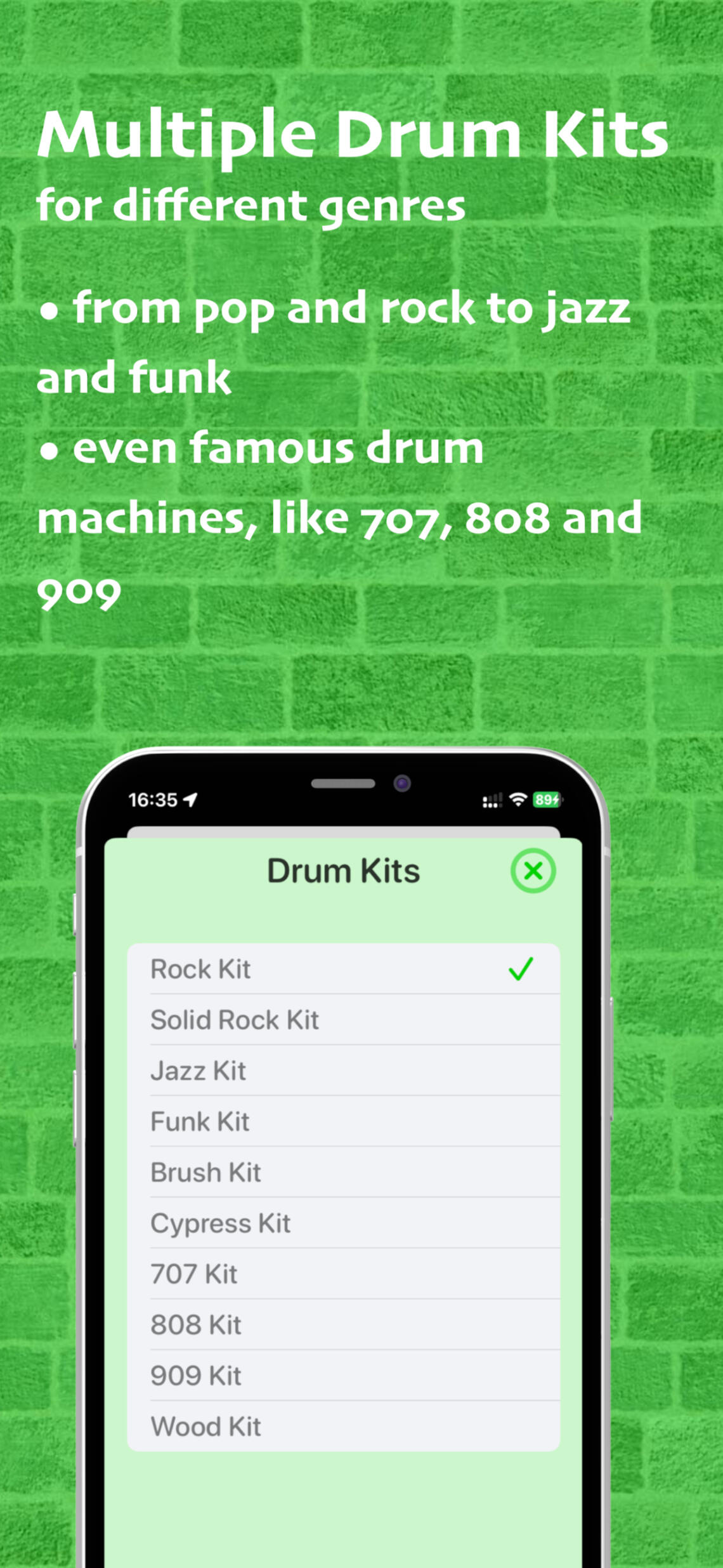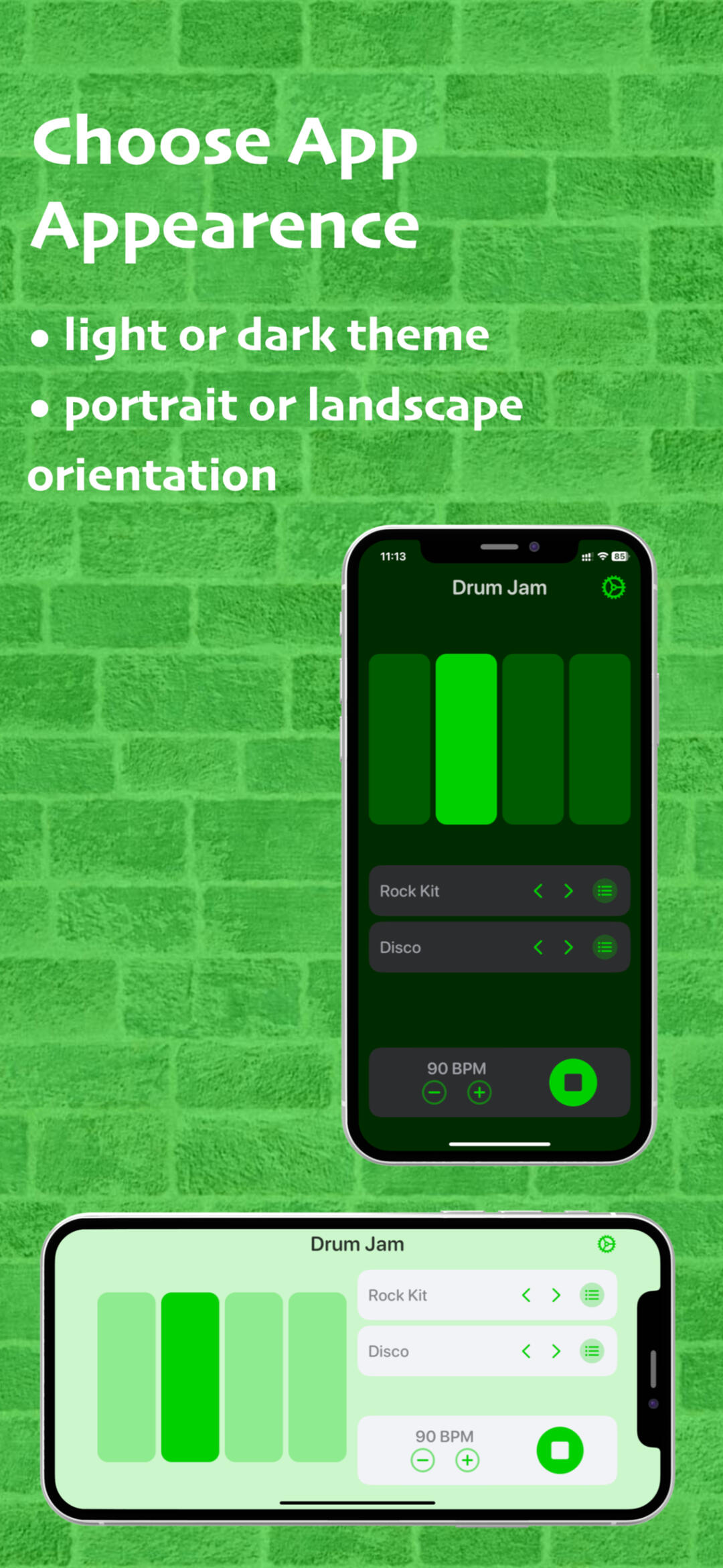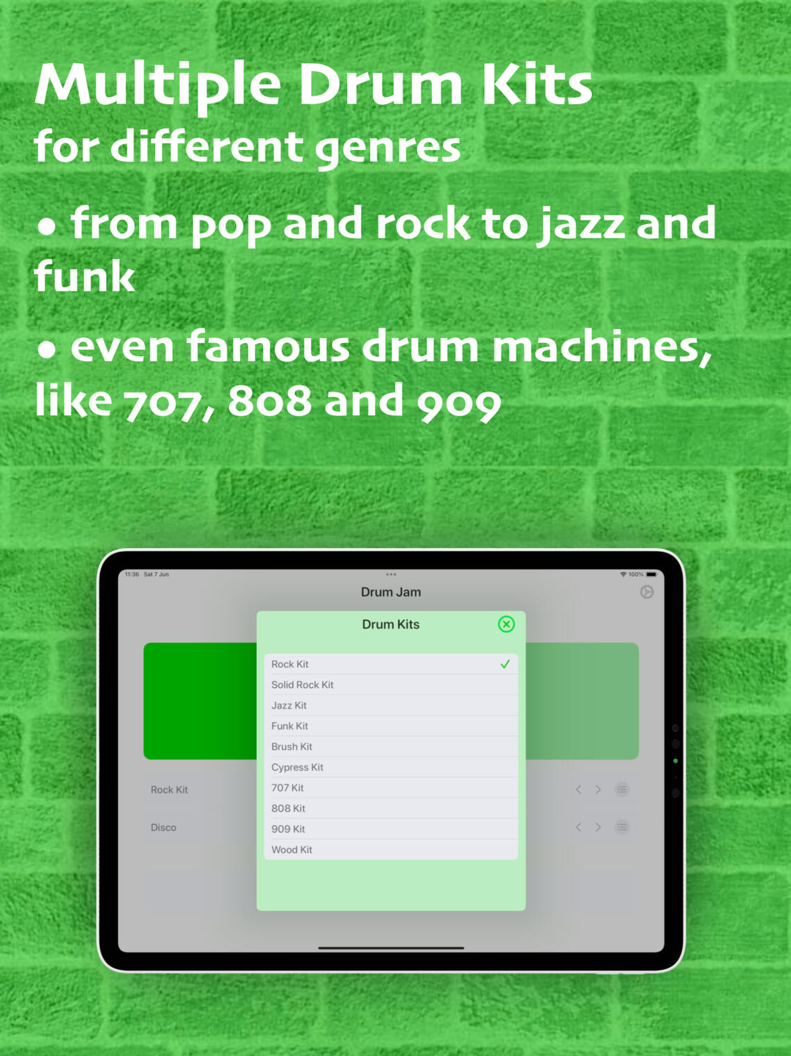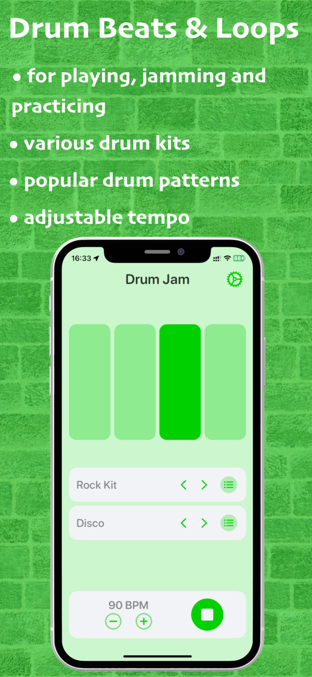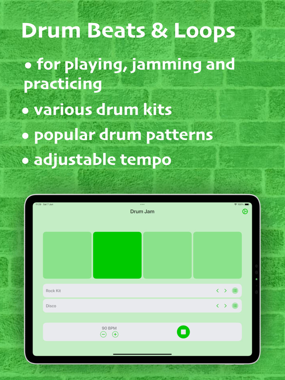 Drum beats and loops for playing, jamming and practicing. Various drum kits. Popular drum patterns. Adjustable tempo.∘ 10 drum kits for different genres, from pop and rock to jazz and funk and even famous drum machines, like 707, 808 and 909∘ 110 drum patterns for popular genres, from pop and rock to shuffle and motown.∘ Adjustable tempo, from 50 till 180 BPM (beats per minute)∘ Use player controls to play, stop and skip the drum beat∘ Connect external Bluetooth speakers∘ Choose app appearance: light or dark theme, portrait or landscape orientation∘ Unlock additional drum kits and drum beats & loops with a monthly subscriptionDrum Jam supports version iOS 16 or later for iPhone and iPad.Stay tuned for upcoming updates and drum on!